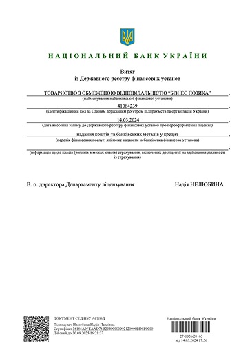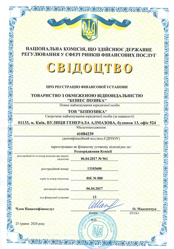 Товариство з обмеженою відповідальністю “БІЗНЕС ПОЗИКА” 01133, м. Київ, бульвар Лесі Українки 26, офіс 411.