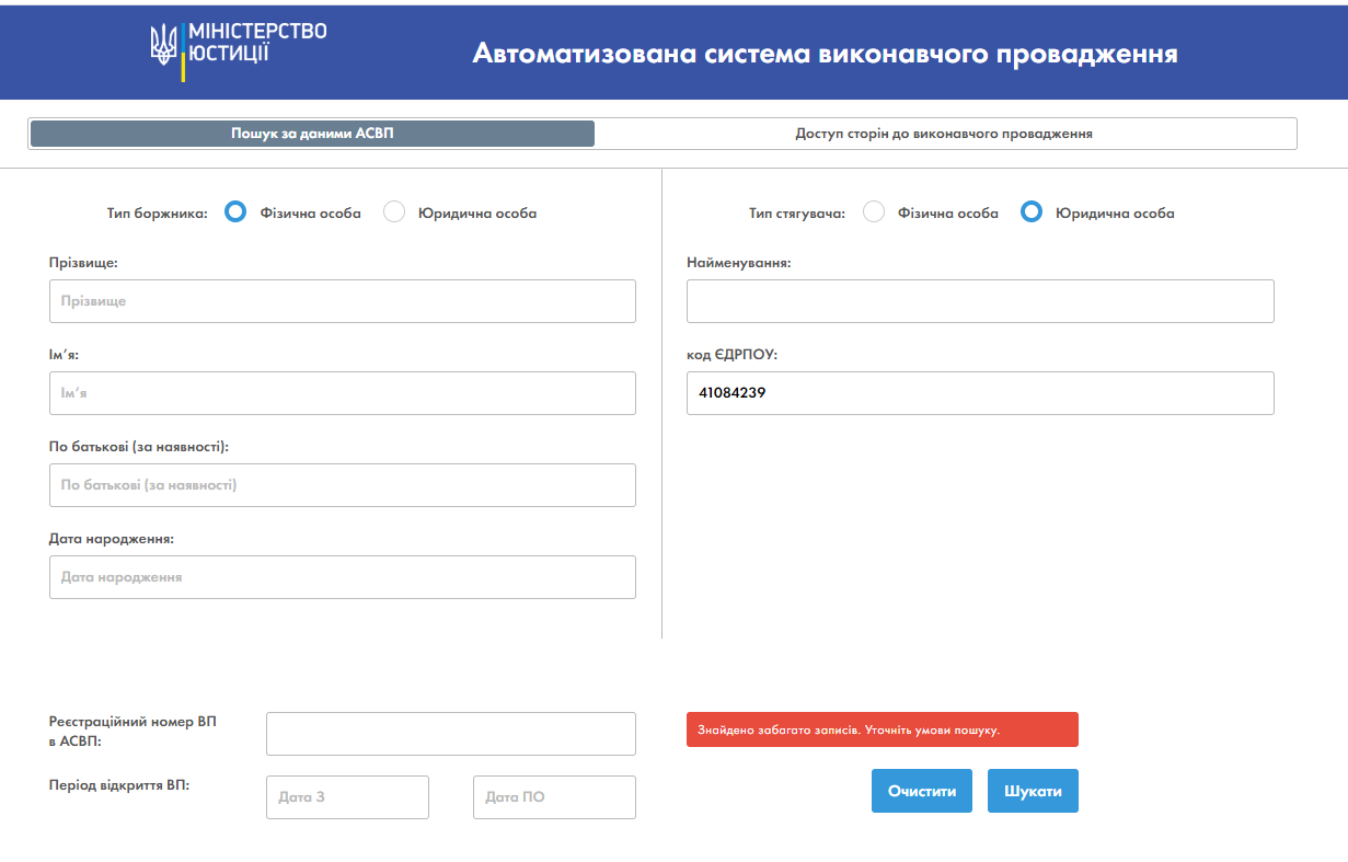 «Тип стягувача» выберите «Юридична особа» и укажите наш ЕДРПОУ – 41084239. Открытых производств очень много, поэтому Вам нужно указать Ваше ФИО.